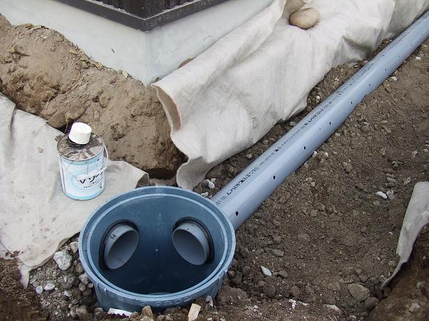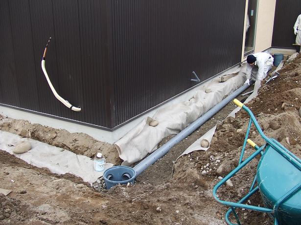 水溜りが出来ないように管を埋め、雨水をしみ込ませます。