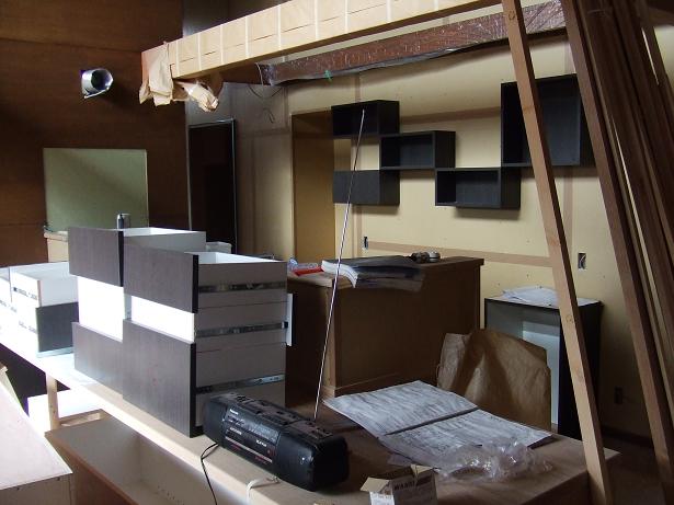 キッチンには棚や収納が運ばれてきました。